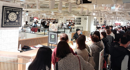 阪神百貨店(梅田本店)を覗くと、何やら行列が…「KASHO SANZEN」という看板が目に入りました。これってまさか宮城の?あの萩の月で有名な? 店員さんに聞いてみると、「ハイ、そうですぅ〜。開店記念として萩の月と萩の調 煌の特別セットを販売しています」とのことでした。