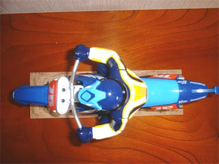 | 走らせてみたら、舗装道路は問題なく走ります。未舗装路も平らだったら走ります。でも砂利道はとても無理。砂利でもラジコンのスケールで考えてみたら大石ですよね。砂利道は超ガレガレのハードコースになってしまい、一発ではじき飛んでしまいました。ライダーの人形がシッティングで全然抜重しないのも問題かも。走らせながら写真を撮るのは1人では難しかったので走行写真は撮りませんでしたが、そのうち載せるかもね。一台持ってても良いかも。 | |