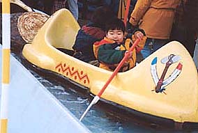 (右)カヌーをこいでご機嫌なせいじ